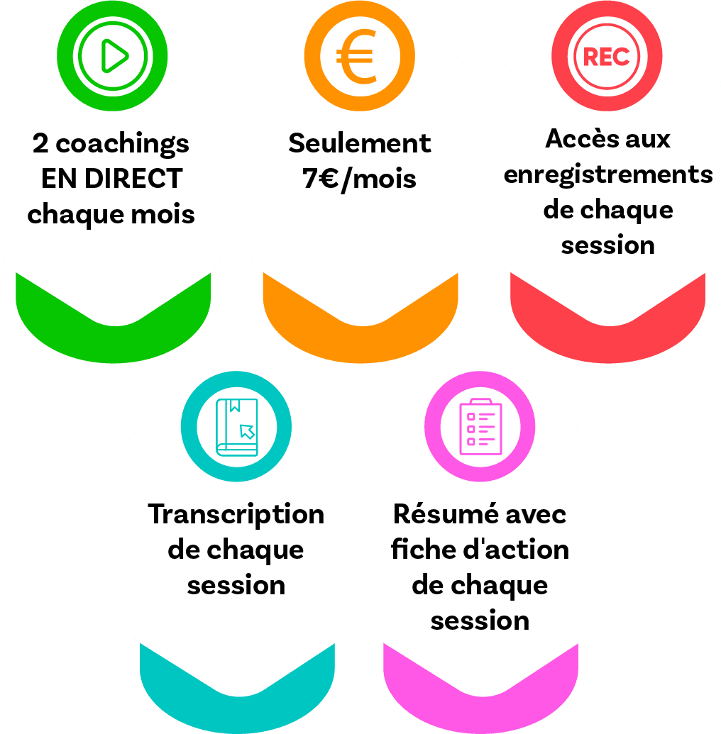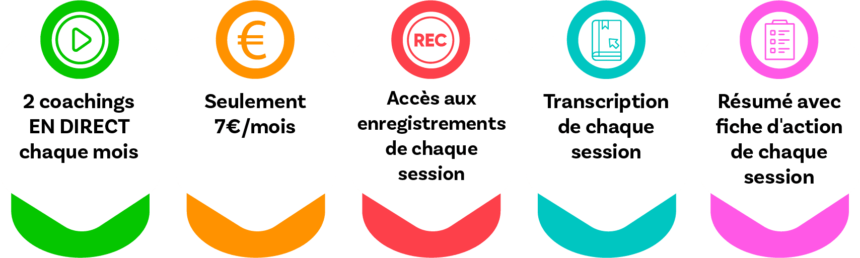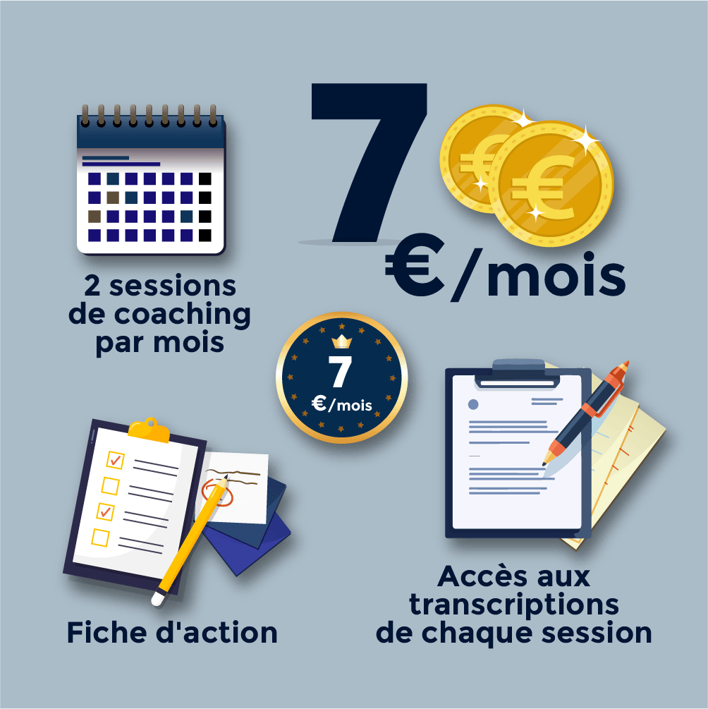 Vous recevrez 2 sessions de coaching EN DIRECT chaque mois, pour seulement 7€.
